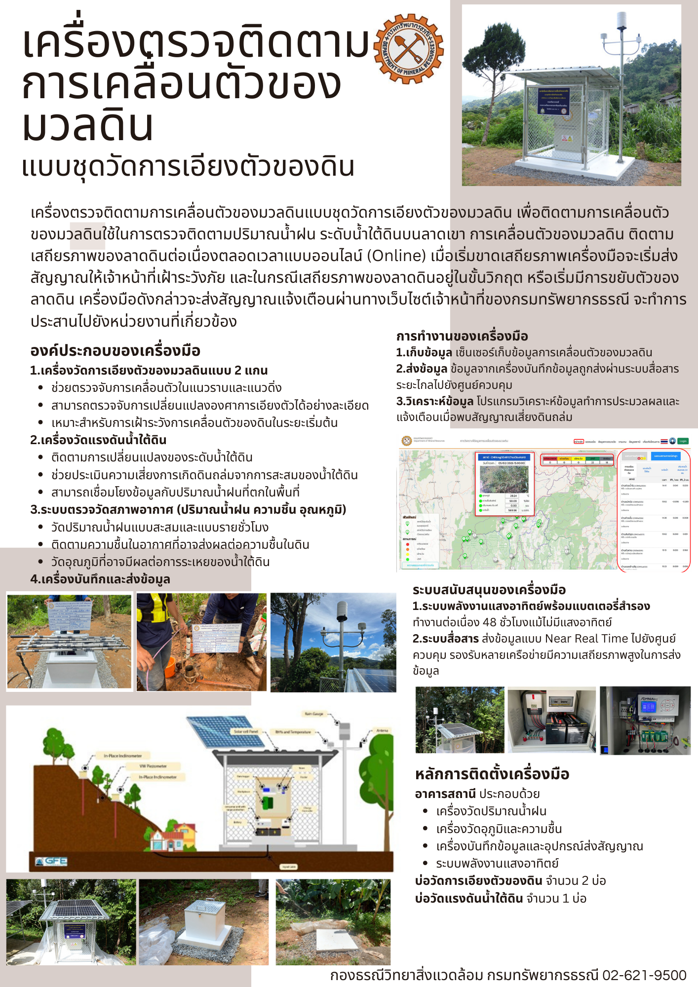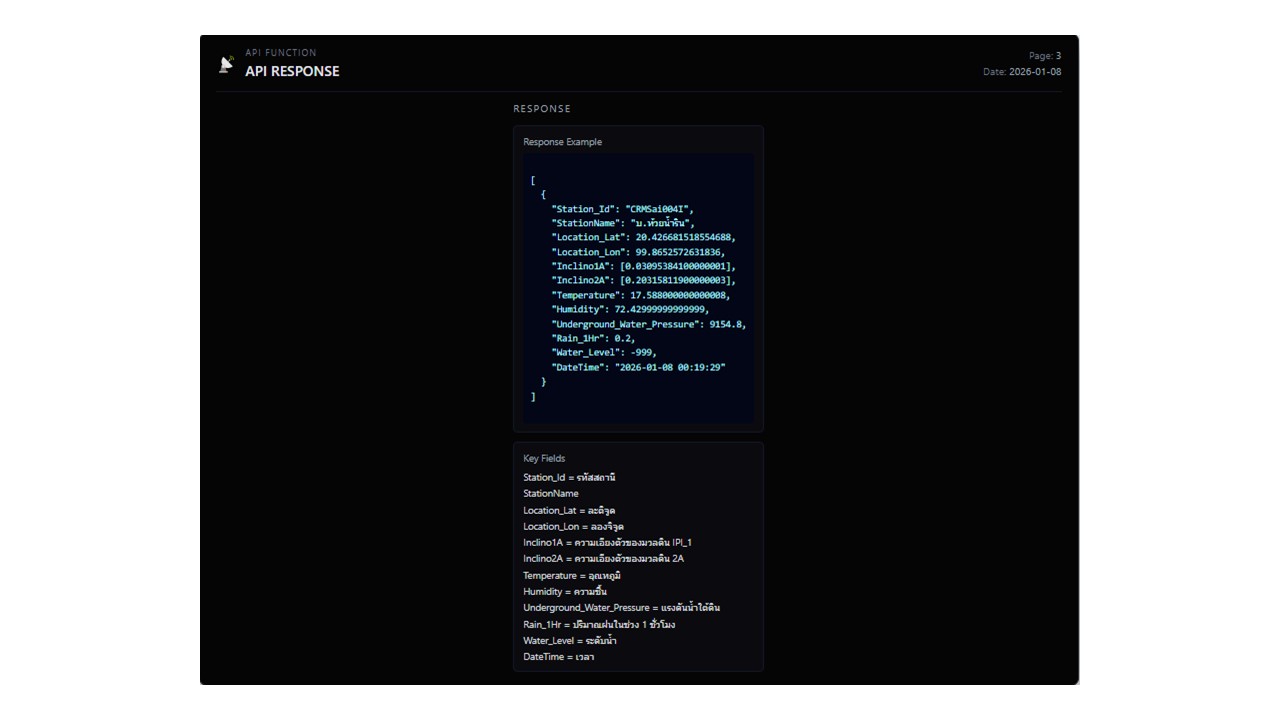 API นี้ใช้สำหรับให้บริการข้อมูลการวัดการเคลื่อนตัวของมวลดิน แบบ Real-time ในรูปแบบ JSON สามารถนำข้อมูลไปใช้งานร่วมกับ Dashboard, Mobile App และระบบอัตโนมัติที่ต้องการข้อมูลการวัด การเคลื่อนตัวของมวลดินที่ถูกต้อง